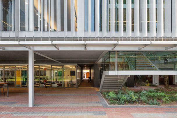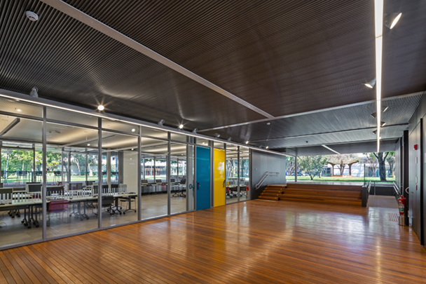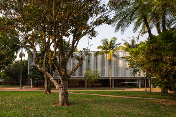A envoltória do volume suspenso é composta por duas camadas. A interna, formada predominantemente por painéis de vidro, reforça a integração desejada com os jardins do colégio e garante luz natural abundante para o seu interior. A camada externa, composta por lâminas de alumínio perfuradas e tensionadas, funciona como mediadora, filtrando a luz e modulando a relação dos espaços internos com os externos.