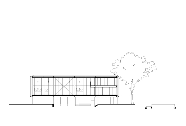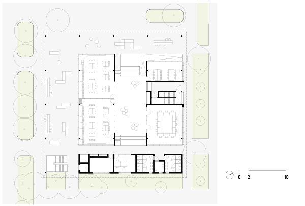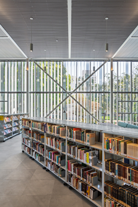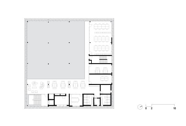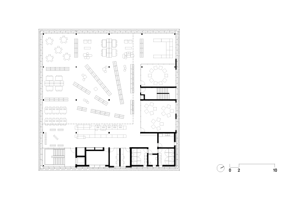 Como consequência direta desta primeira decisão, alojamos as atividades mais reservadas da biblioteca neste volume generoso e elevado do solo. O volume superior se apresenta como um espaço livre, de pé direito duplo, amplo e flexível, apto a enfrentar a mutabilidade dos processos didáticos – uma característica especialmente importante em tempos de grandes transformações no modo de organizar e difundir informações.