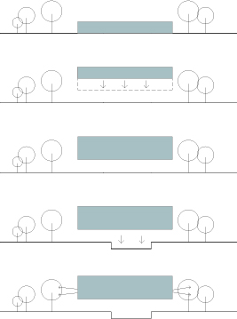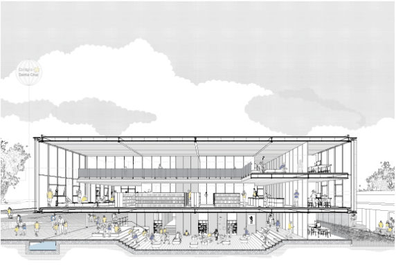 Nosso projeto mantém a posição do novo edifício no campus, mas transforma totalmente sua relação com o entorno. Optamos por suspender o volume principal da biblioteca, criando uma arena central e amplas varandas integradas à praça e aos jardins do colégio. O gesto é claro: a biblioteca, hoje, deve funcionar como ponto de encontro e reunião da comunidade escolar, verdadeiro centro de convergência, tanto do ponto de vista físico-funcional, quanto do ponto de vista simbólico.