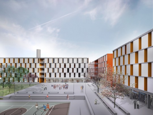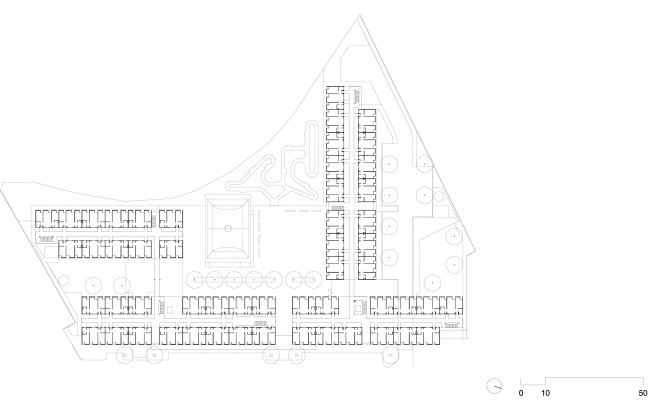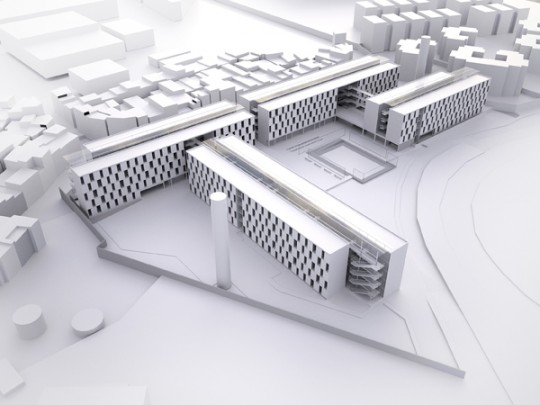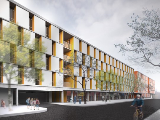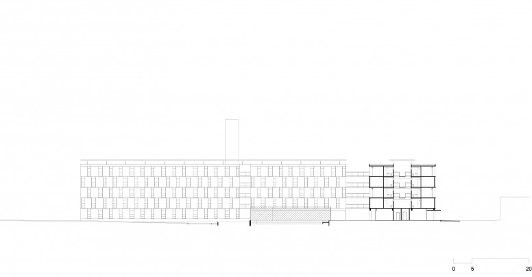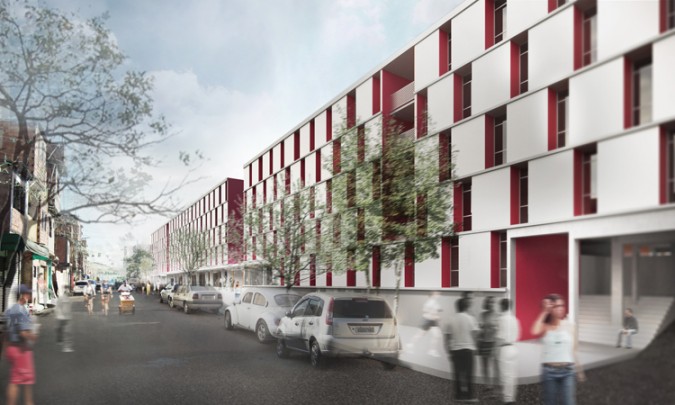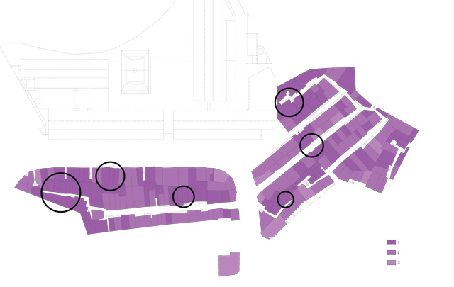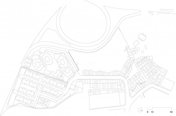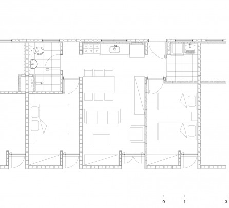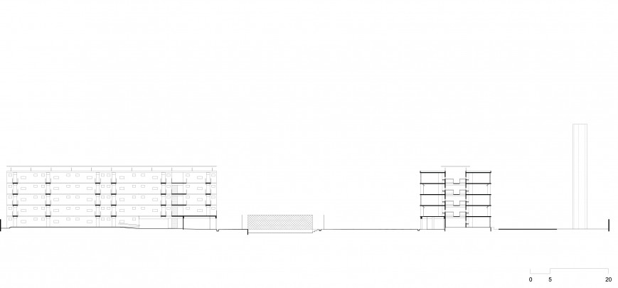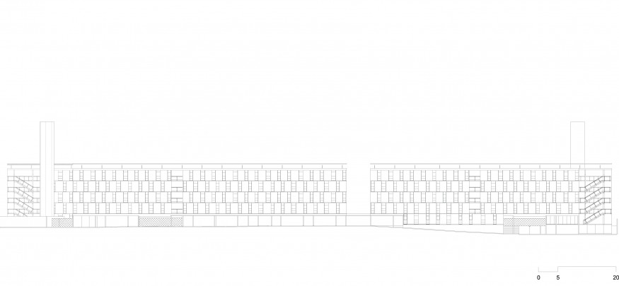 A busca pelo convívio em comunidade guiou a proposta até mesmo no desenhos dos edifícios em si. Toda a circulação se faz por escadas abertas e passarelas elevadas que, afastadas das paredes do edifício, garantem a privacidade de cada unidade e ao mesmo tempo permite o contato visual entre todos os andares. Por fim, nos cruzamentos entre escadas e passarelas se conformam praças de acolhimento cobertas, que com pé-direito de quatro pavimentos de altura conectam os edifícios vizinhos.