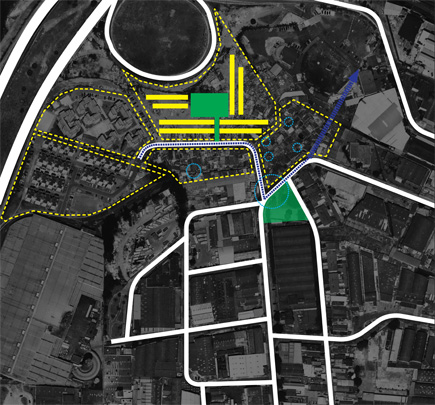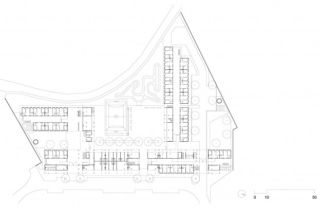 Levando-se tais aspectos urbanísticos em conta e ainda considerando a rica dinâmica social da favela na qual o conjunto se insere, o projeto assume como ponto capital a criação de espaços públicos de qualidade, que extrapolam os limites do edifício e geram em seu entorno melhorias para toda a comunidade. Desta forma optou-se por criar uma grande praça central no miolo da gleba destinada ao empreendimento, equipada com quadra , bancos e equipamentos de ginástica, que organiza os edifícios em seu entorno e amplia as opções de lazer da região. No seu entorno, conformando uma espécie de loggia para a praça, foram posicionadas áreas comerciais, equipamentos públicos e de uso comunitário: um telecentro, um ponto de leitura e um salão para reuniões da associação de moradores. Em complemento a praça, no alinhamento da rua Sampaio Correia, foram previstas áreas comerciais no térreo e uma marquise desenhada para abrigar os pedestres que passarem por esta calçada.