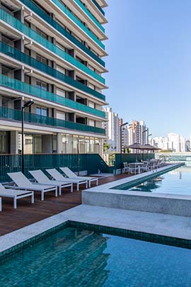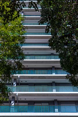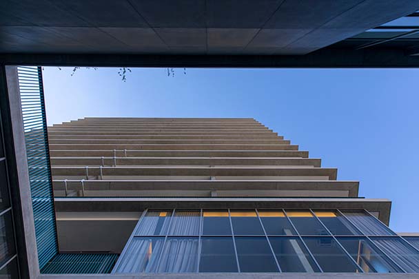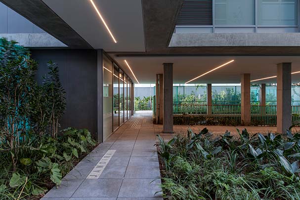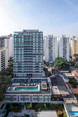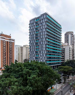 A volumetria, composta pelo embasamento suspenso e pela torre residencial, se ajusta ao desenho da quadra, fazendo a transição da avenida, movimentada e densa, para o interior do bairro, predominantemente residencial. A distribuição dos terraços, complementados pelos guarda-corpos coloridos, conferem leveza e movimento à torre. Para o fechamento dos volumes, utilizamos um sistema de fachada ventilada, de painéis minerais compostos, ampliando a nossa pesquisa no uso de componentes e de sistemas de montagem na arquitetura.