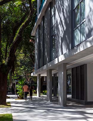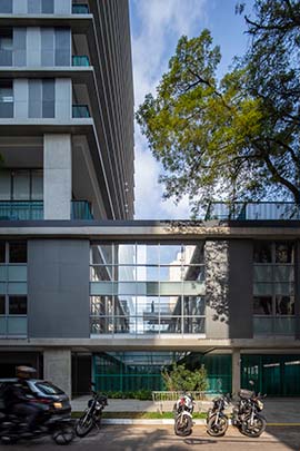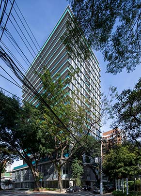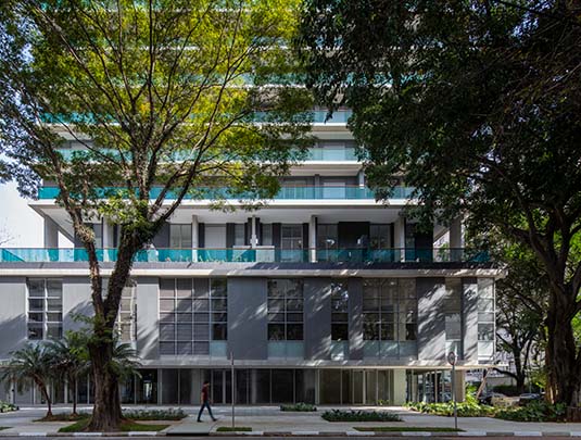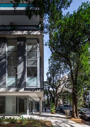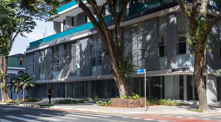 Concluímos recentemente o Elevo, edifício de uso misto, localizado no cruzamento de duas ruas amplamente arborizadas do bairro de Moema. Ele é composto por lojas, escritórios e apartamentos de dois e três dormitórios. A implantação do conjunto se organiza a partir do volume do embasamento, que contém as lojas, os acessos para a torre residencial e os acessos para os escritórios, que estão distribuídos no primeiro e segundo pavimentos da base. Os planos recuados das fachadas deste volume suspenso configuram uma marquise de proteção, que contorna o conjunto e se integra às árvores do passeio.