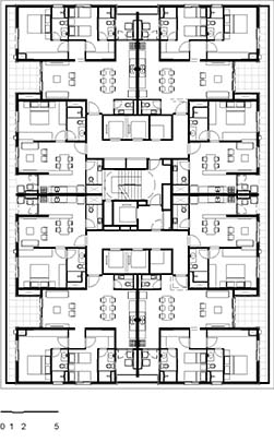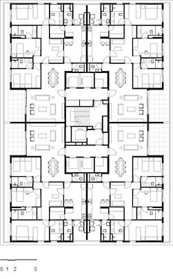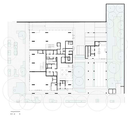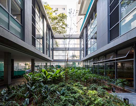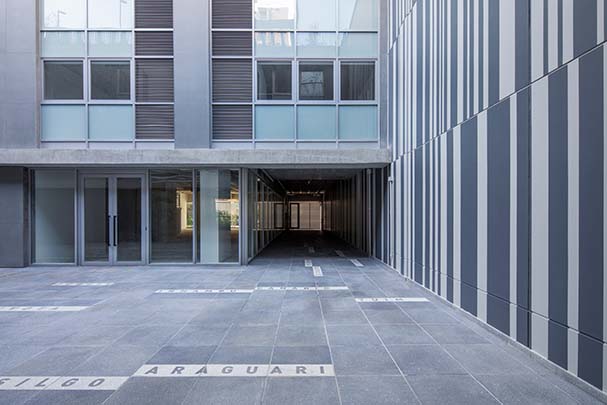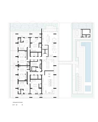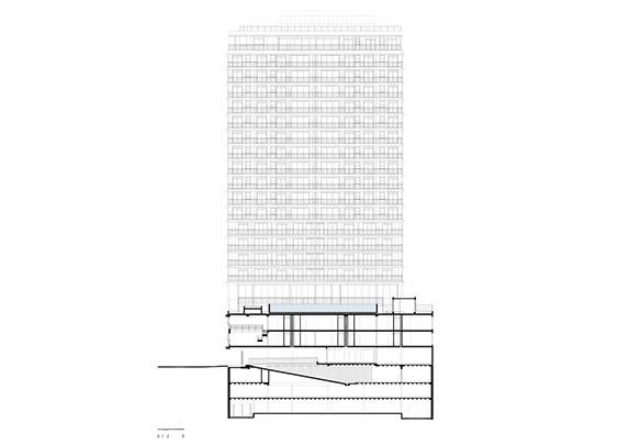 Na cobertura do embasamento, está localizada a área comum dos moradores, que se estende para um amplo terraço descoberto, localizado sobre os pavimentos dos escritórios. Entre os dois volumes, se abre um amplo pátio ajardinado, que ilumina os espaços internos e cria o gradiente de privacidade necessário para regular a convivência entre os diversos usos do conjunto.