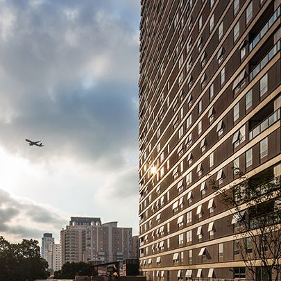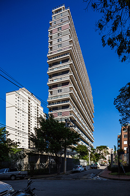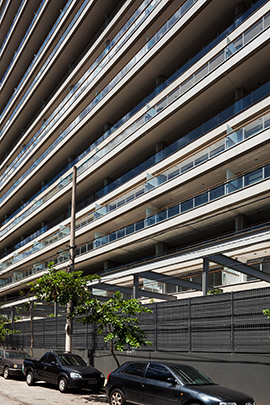 Na face principal em que isso ocorre, voltada para sudeste, a marcação horizontal da laje ganha um balanço de 2,5 metros, tanto nos andares de laje maior quanto nos de laje menor. Assim, se as varandas têm a mesma profundidade, o que varia é o tamanho da unidade. Nos andares com menor profundidade, o balanço das varandas ganha também as duas laterais. Na outra fachada extensa, destinada à circulação comum, o edifício não possui nenhuma protuberância ou reentrância, mas permanecem a marcação horizontal das lajes e a coloração sóbria dos fechamentos.