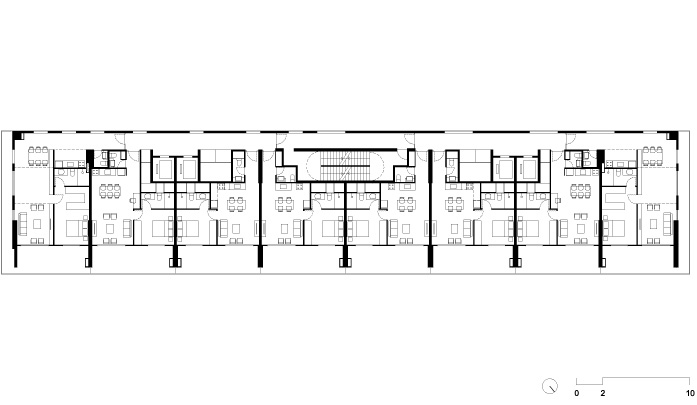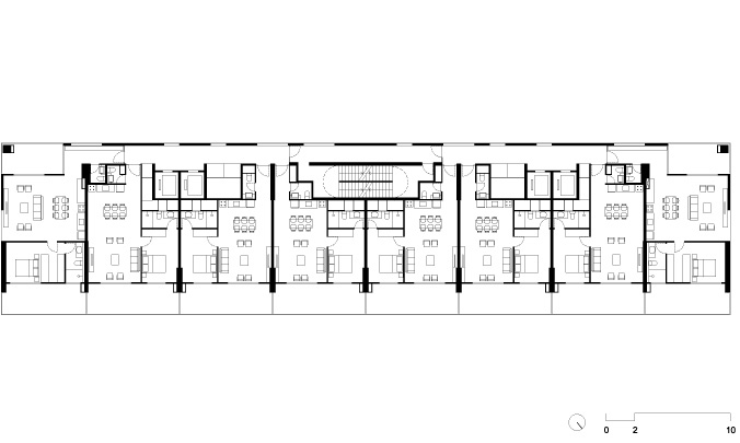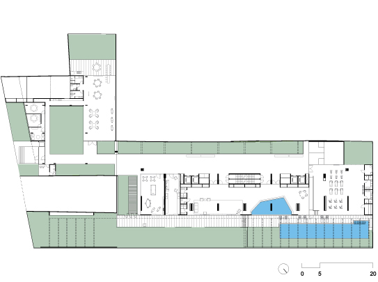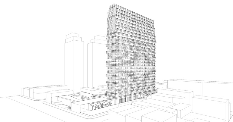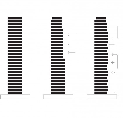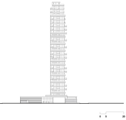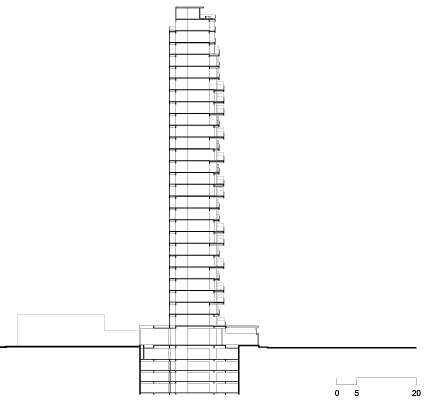 O partido arquitetônico pretendido era uma lâmina pura, sem variação de espessura. Contudo, aplicada a legislação municipal, chegou-se a um volume escalonado em dois momentos, proposta rechaçada pela equipe. Por isso surgiu uma solução em que predomina o ritmo horizontal de lajes com dimensões diferentes, de modo a não evidenciar a percepção do escalonamento. Dessa forma, há dois pavimentos-tipo com larguras diferentes embaralhados em ritmo irregular: dez andares possuem a configuração mais estreita, com 12,5 metros; e 14 seguem a largura maior, de 14 metros.