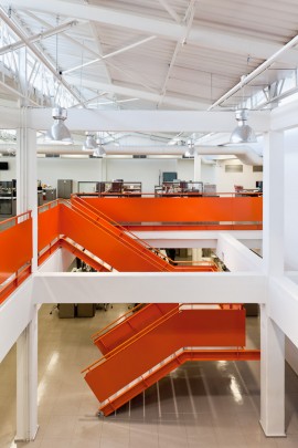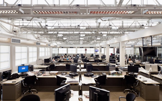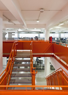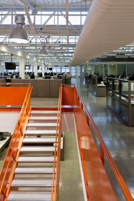 As redações foram relocadas entre o 4º e 5º pavimentos do edifício central, onde conseguimos remover um trecho da laje promovendo a unidade espacial. Duas escadas extras potencializam esta comunicação. Ainda pensando na fluidez dos espaços, posicionamos as salas de reuniões de vidro nas laterais e mesas de trabalho ao longo de toda área central, paredes foram removidas tornando o espaço mais panorâmico possível.