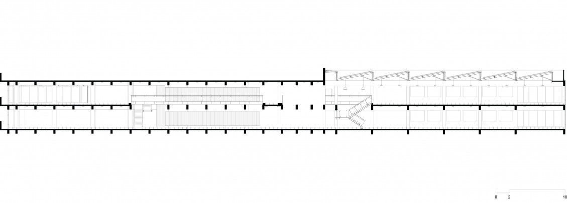 Os novos elementos introduzidos no edifício identificam-se facilmente por serem leves, como estruturas de aço e painéis de policarbonato.