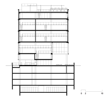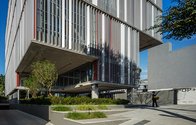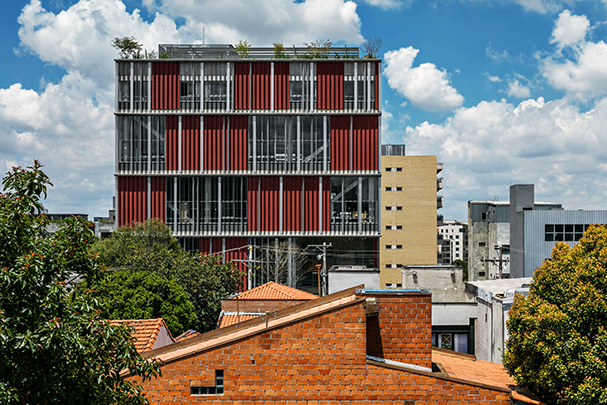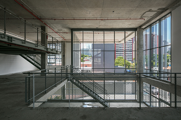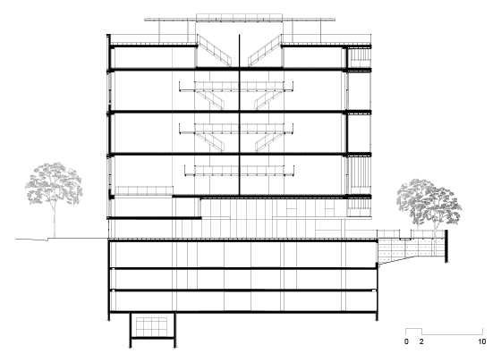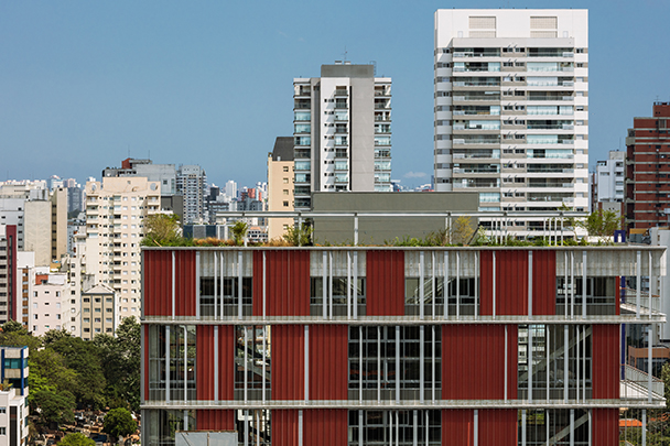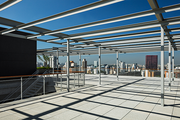 O uso de quebra-sóis laminares, em chapa perfurada, ao redor do volume, cria um envelope protetor que dá unidade e caráter ao edifício. As varandas, com 3 metros de profundidade, estão localizadas na fachada que se abre para o parque, o que permite a criação de espaços de convívio, ou mesmo de trabalho, junto às copas das árvores.