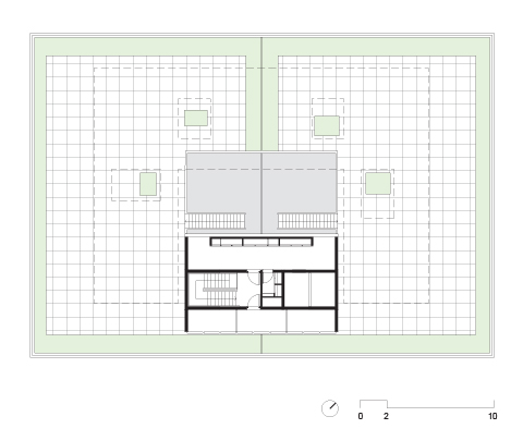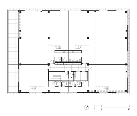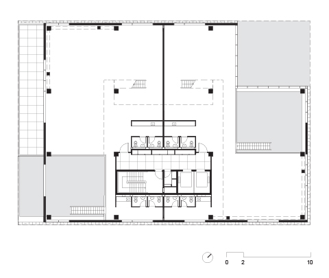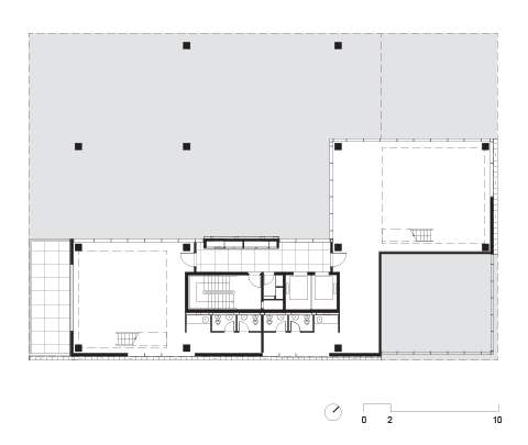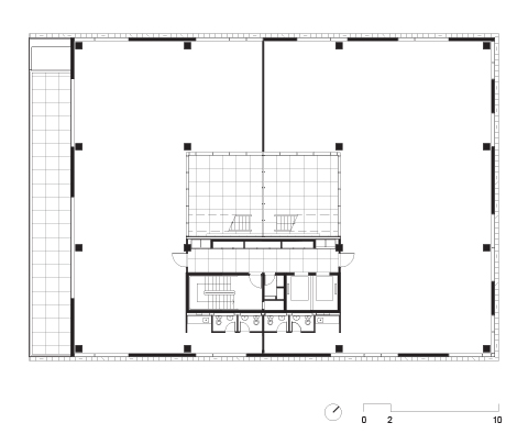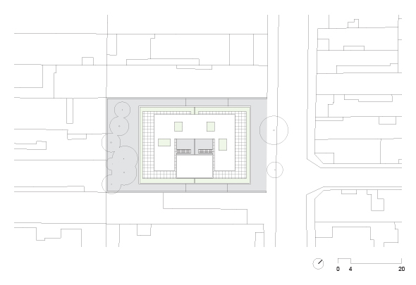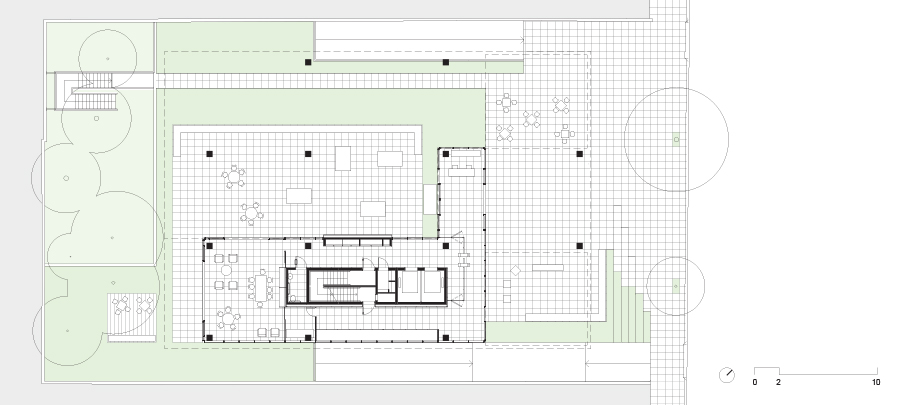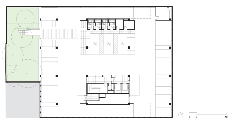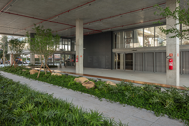 A implantação parte da criação de uma praça de entrada sob o edifício, que está totalmente conectada tanto com a rua quanto com o parque nos fundos do terreno. Com pés-direitos variáveis, a praça serve não só de área de convívio para os usuários do prédio como faz a conexão visual do parque com o espaço público da rua.