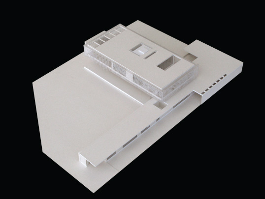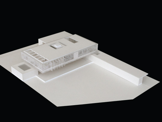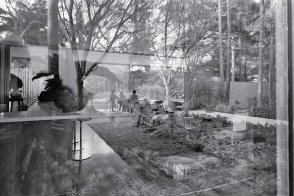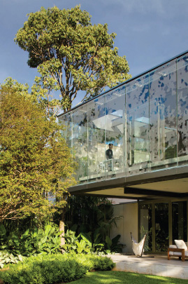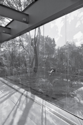 Todo o volume superior é fechado por uma pele de vidro serigrafado, que funciona como filtro de luz e quebra-sol. A estampa que compõe a serigrafia funciona como uma reverberação da imagem do parque na superfície da casa, reforçando a interdependência entre o objeto arquitetônico e a natureza.