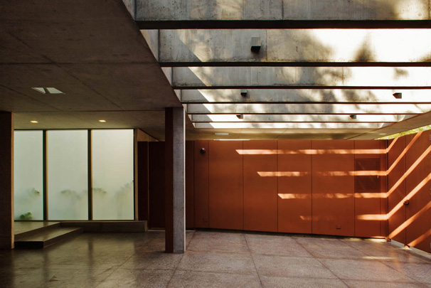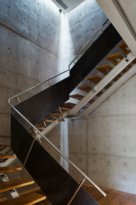 A estrutura do volume de vidro foi concebida de tal maneira que ele parece flutuar sobre o jardim, sustentado pelo pilar central de concreto armado, que abriga também a escada de acesso ao pavimento superior. A articulação entre os planos horizontais e este pilar de sustentação é reforçada pela criação de vazios ao redor de toda a caixa de concreto, que são utilizados também para trazer luz natural da cobertura para o interior da casa.