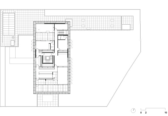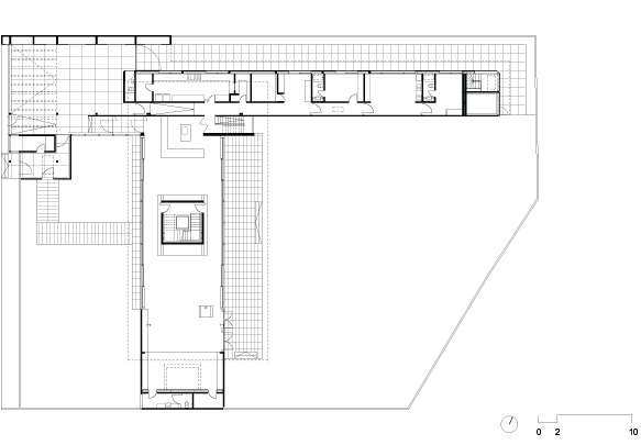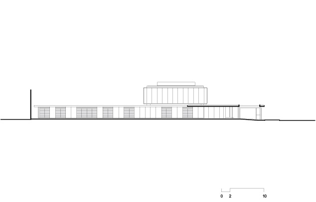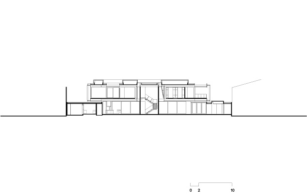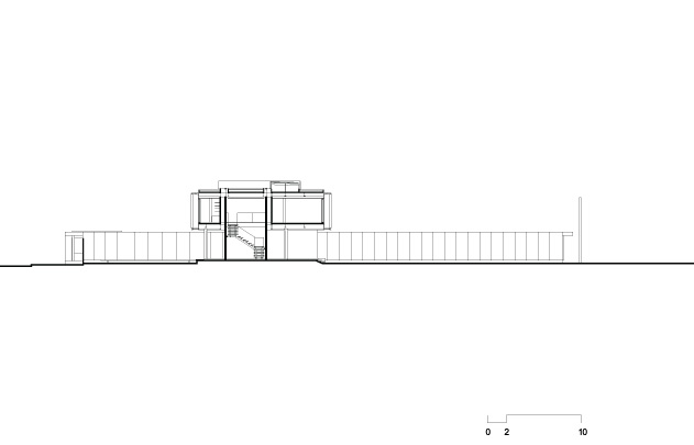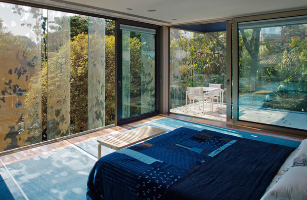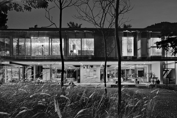 No térreo, os espaços de convívio estão localizados sob a sombra do volume superior da casa, conectados aos jardins através de uma grande varanda e das portas de correr de vidro – que podem ser recolhidas totalmente, criando uma abertura de 14m de largura. O volume superior, concebido como uma caixa translúcida, abriga os quartos e outros ambientes que requerem maior privacidade.