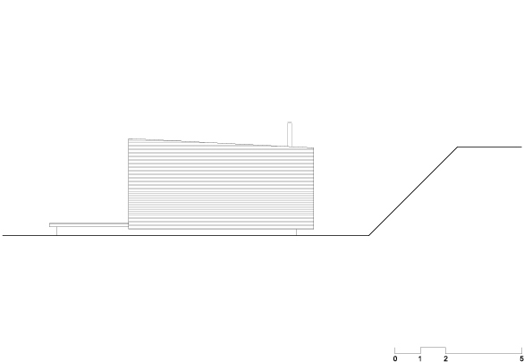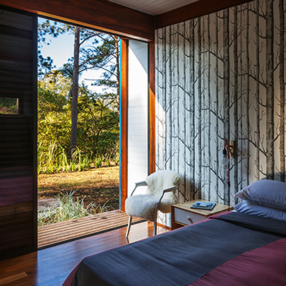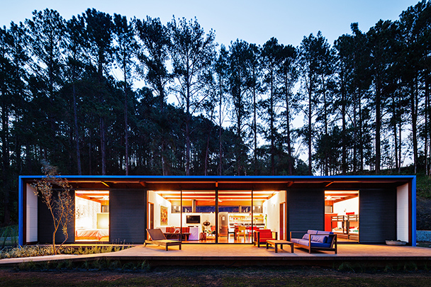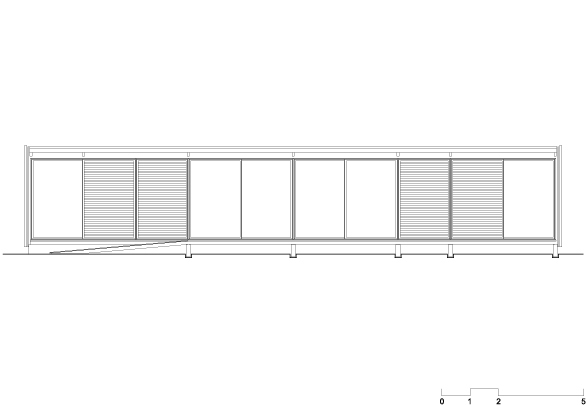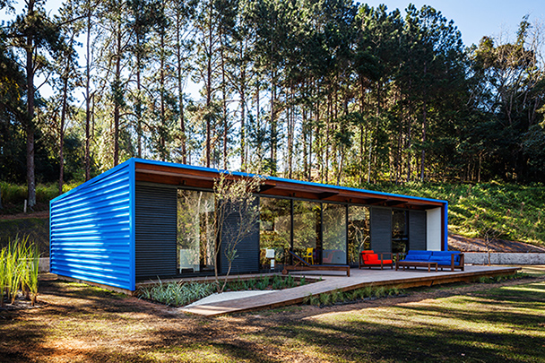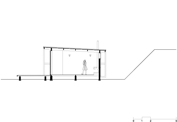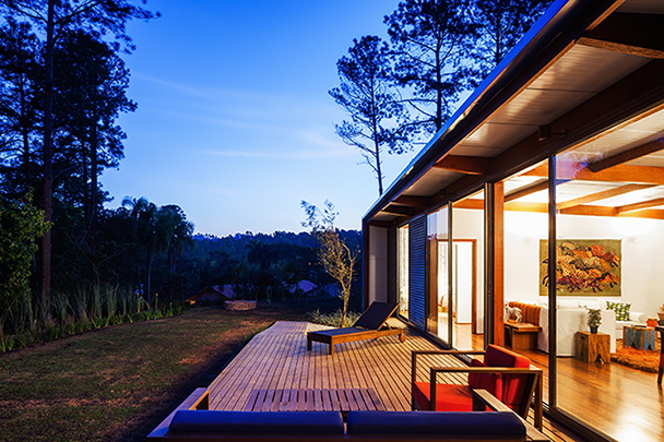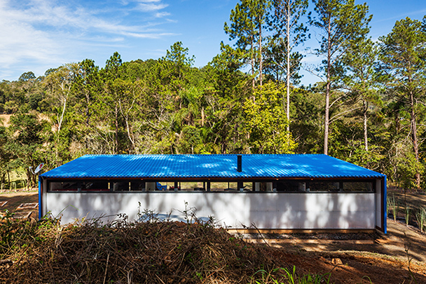Destinada a breves estadias, o pavilhão resolve de maneira sintética o programa de duas suítes e uma sala com a cozinha integrada, organizados linearmente permitindo sua abertura para a vista e a vegetação circundante. A construção começa por baldrames aflorados em concreto aparente e sobre eles uma estrutura modular em madeira. A cobertura e as fachadas laterais são feitas com telhas metálicas e enchimento de poliestireno para proteção térmica. A fachada sul, inteiramente de vidro, abre todos os ambientes internos para a vista e é prolongada para além da casca de telha metálica por um amplo deck em madeira. Do lado norte, próximo à encosta, o volume é fechado por painéis de policarbonato alveolar e uma faixa de caixilhos elevados, protegendo os ambientes internos do sol.